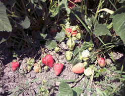 El cultivo rey de este mes han sido, sin duda, las fresas. Las dos tablas (que suman 20 metros lineales de matas) han proporcionado unos 2 kg de frutos. Estamos esperando a terminar de cosecharlas para limpiar las tablas de hierbas ya que ahora mismo están invadidas, como se observa en la foto, lo que tampoco parece que les afecte mucho. También entonces aprovecharemos para eliminar estolones que ya comienzan a aparecer. Algunas, pocas, las encontrábamos medio comidas, suponemos que por babosas, sus tradicionales enemigos. En cualquier caso, las pérdidas por ese motivo han sido mínimas.